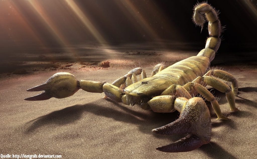 Bei Futterbedarf stellt sich der ca. 8 Zentimeter große und blinde Skorpion in dem lockeren Wüstensand so auf, dass seine 8 Beine einen Kreis von etwa 5 Zentimetern Durchmesser bilden. Und in dieser Position erwartet er nun Schallwellen.